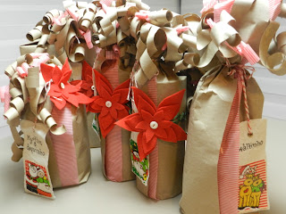 Tudo em papel kraft com detalhe em papel de seda listrado em vermelho e branco e com as tags de tecido. Os presentes femininos tem também uma flor em feltro.